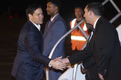 अमेरिका मार्को रुपिओको सचिव, (बायाँ), चालक दलका सदस्यहरूलाई अभिवादन गरियो, जबकि होमस्टेस्टेस्टेड, मार्च 9 मा फ्लड। (एपी)
