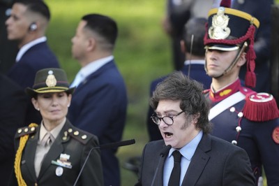 Argentine राष्ट्रपति Javier माईई एक समारोह को बखत अर्जेटालिवासीहरु बीच द्वन्द्वको वार्षिकोत्सवको वार्षिकोत्सवको वार्षिकोत्सवको वार्षिकोत्सवमा अप्रिल 2 मा, ब्यूनस आयर्समा एक युद्ध स्मारकमा। (एपी)