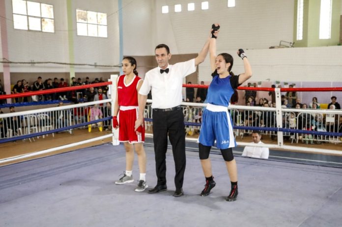 जवान अल्जेरियन महिलाहरू Azaza शहर मा क्लब बक्सिंग रिंग मा अभ्यास गर्छन्।