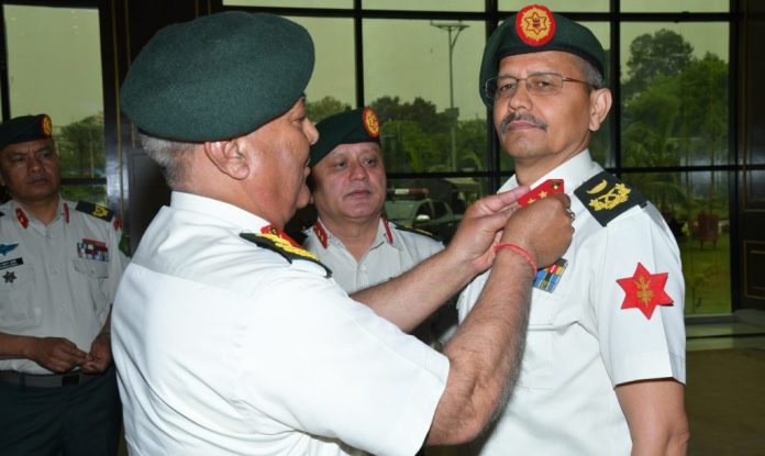 काठमाडौं : नेपाली सेनाको उपरथी दर्जामा पदोन्नति भएका सहायक रथी मानबहादुर महरालाई आज प्रधानसेनापति महारथी अशोकराज सिग्देलले जंगी अड्डामा आयोजित कार्यक्रमबीच दर्ज्यानी चिह्न प्रदान गरेका छन्।