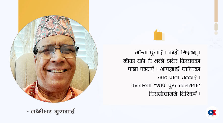 म आफ्ना कोठामा पसें । पुस्तकबाट थुतेर ल्याएका पाना पल्टाएँ, तिनीहरूलाई एउटा कपीमा सारें । सारिसक्न मलाई झण्डै दुईदिन लाग्यो । घरमा माध्यमिक तहमा पढ्ने भाइ थिए, श्रीधर । किताबका पाना थुतेर ल्याएको उनले थाहा नपाउने भन्ने थियो । किनभने, उनले मलाई आदर्श मान्ने गरेका थिए । यस्तो बदमासी थाहा पाए भने मप्रति उनको दृष्टिकोण कस्तो होला ? उनका दृष्टिमा म चुर्लुम्म डुब्न बेर लाग्ने छुइँन भन्ने सोचेर पूर्ण सतर्क अनि सचेत थिएँ ।