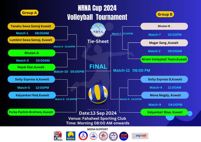 एनआरएनए एनसिसि कुवेतले आगामी सेप्टेम्बर १३ तारिख, शुक्रवारका दिन फाहिल स्पोर्टिङ क्लबको हलमा भलिबल प्रतियोगिता आयोजना गर्ने भएको छ। प्रतियोगितामा दुई भुटानी टिम सहित १३ भलिबल कल्वले सहभागिता जनाउने भएका छन ।