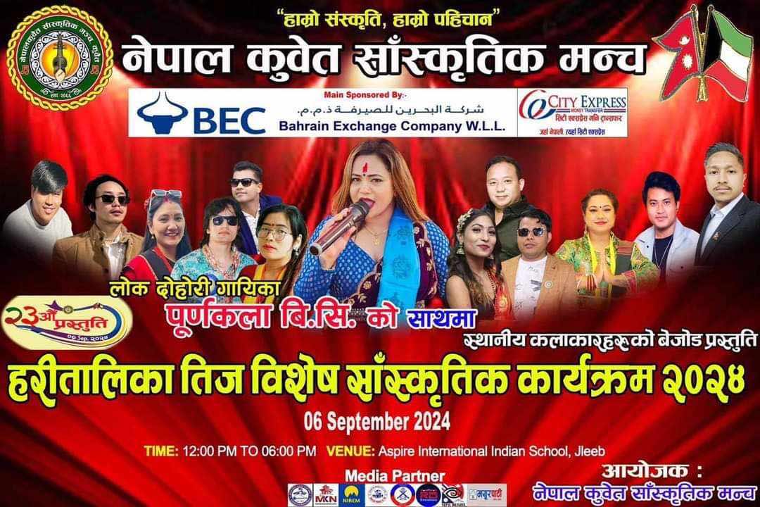 कुवेतको जिलिपस्थित एस्पाएर ईन्डियन स्कुलको सभाहलमा ०६ सेप्टेम्बर २०२४ शुक्रवारका दिन चर्चित राष्ट्रिय लोक दोहोरी गायिका पूर्णकला बि.सीको उपस्थितिमा हुने हरितालिका तीज विशेष साँस्कृतिक कार्यक्रमको सम्पूर्ण तयारी पूरा भएको अध्यक्ष गोबिन्द बरालले जानकारी दिएका छन ।