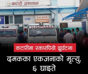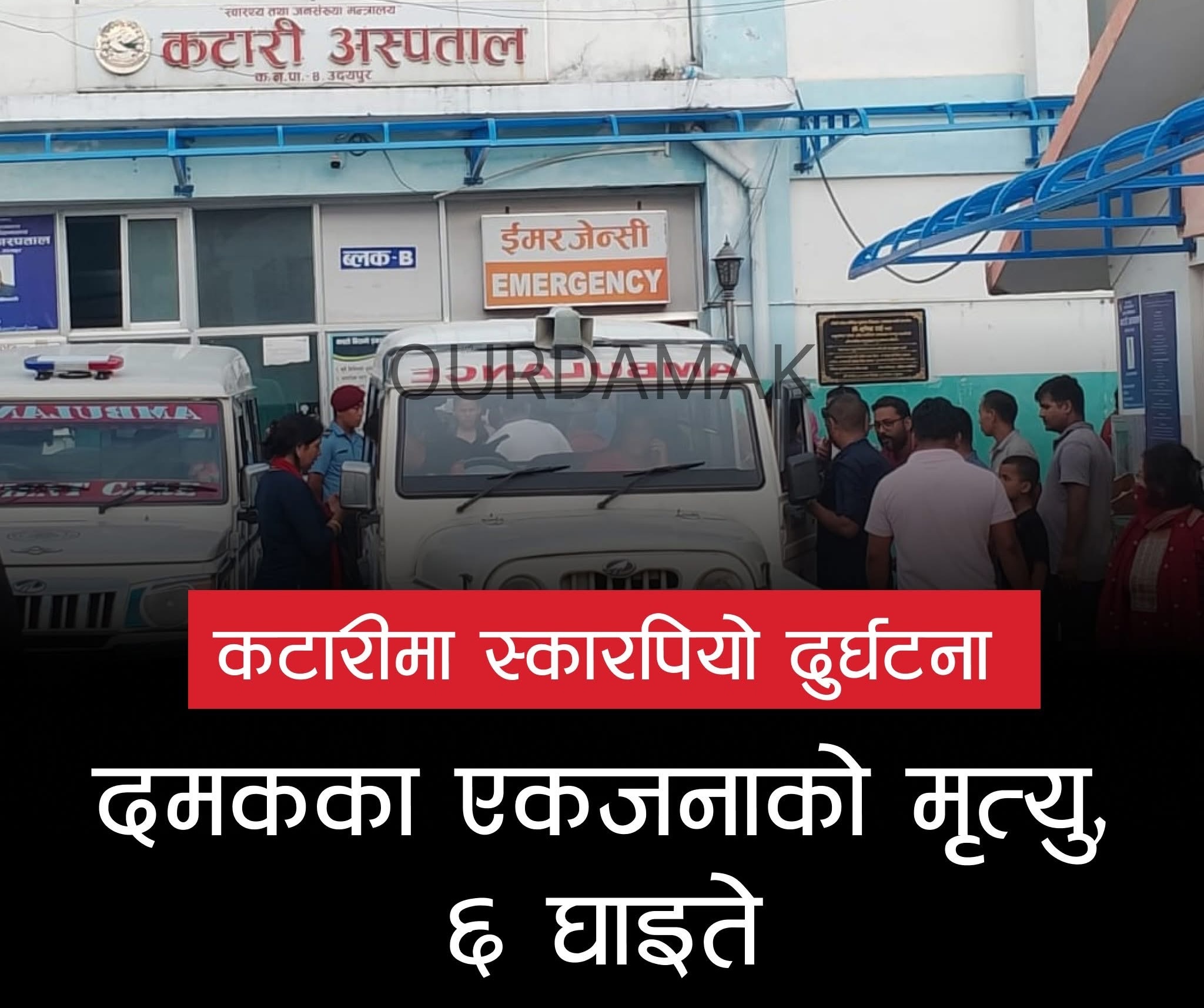 कटारी (झापा), चितवनबाट झापातर्फ आउँदै गरेको मे १ च ३०४० नम्बरको स्कारपियो सवारी अनियन्त्रित भएर ट्रष्टबेरियरमा ठोकिने घटनामा झापा दमक–३ का ५५ वर्षीय माधव बस्नेतको कटारी प्रादेशिक अस्पतालमा उपचारक्रममा मृत्यु भएको छ। घटनामा गम्भीर रूपमा घाइते पाँच जनाको उपचार चलिरहेको छ भने चालक देवेन्द्र तामाङ स्थिर अवस्थामा छन्।