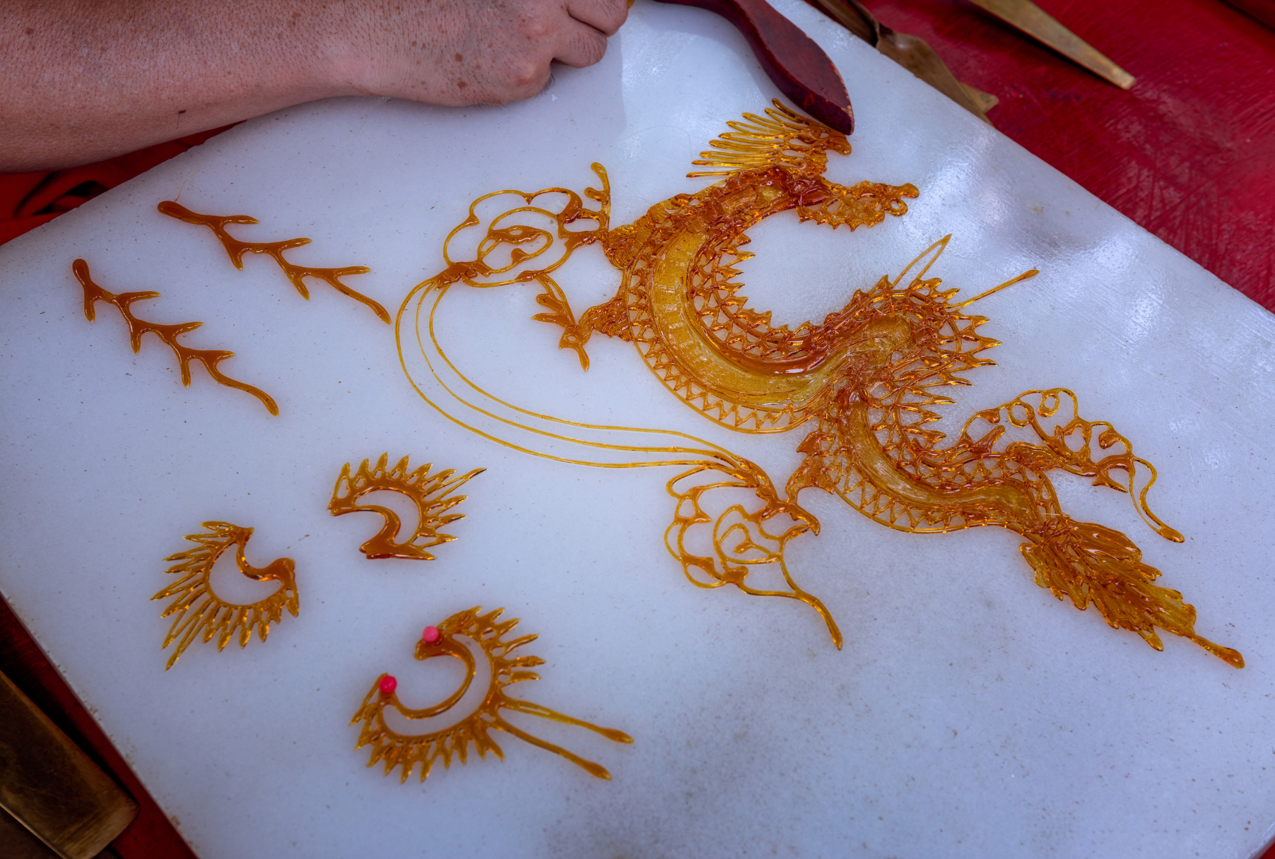 यी जटिल आकारहरू बनाउनको लागि यी जटिल आकारहरू बनाउनको लागि यी सबै खास्तिष्क र मालिस्ट, र मल्टिज, र पहिलो मुख्य कुराबाट बनेको हुन्छ। यदि तापमान धेरै उच्च छ भने, सिरप आकारमा धेरै पानी हुनेछ; यदि तापक्रम एकदम कम छ भने, सिरप कडा र तन्काउन गाह्रो हुनेछ। तातो चिनी सिरप इच्छित ढाँचामा एक मार्बल स्ल्याबमा निहुरिन्छ र त्यसपछि तापमान शीतलहरूको रूपमा ठोस हुन्छ, जसको मतलब यो हो कि एक उत्तम शिगर पेन्टिंग गति हो!