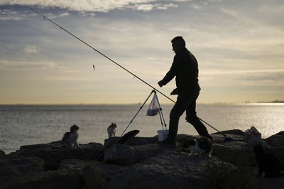 एक माछावालाले बिरालाहरूलाई मारुभूमि सागरबाट साना माछा समातेर अप्रिलबुलमा टर्कीमा हाइकिको साग्रादको साथ साना माछा समात्छ। (एपी)
