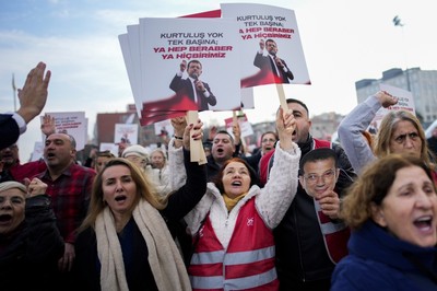 Istanbuul ‘मेयर ekramegloglo समर्थकहरू istanbuula अदालतको अगाडि भेला हुन्छन् जहिले पनि टर्कीमा भेला हुन्छन्। प्लेकार्डहरू टर्कीमा पढ्छन्;’ त्यहाँ एक्लो मुक्ति छैन; या त हामी सबै वा हामी मध्ये कुनै पनि छैन। (एपी)
