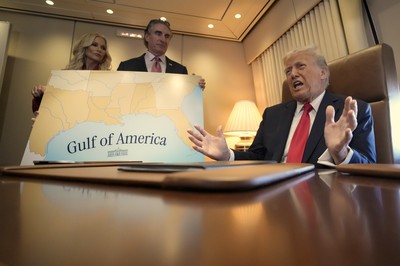 अमेरिकी राष्ट्रपति डोनाल्ड ट्रम्प, (दाँयाबाट), आन्तरिक सचिव डग बर्गम र बर्गमकी श्रीमती क्यावेरीन बर्गम, जब ट्रम्पले युवुक्त पाम फ्लर्डमा हस्ताक्षर गरे। फेब्रुअरी on मा नयाँ ओर्लिनमा फ्ल। (एपी)