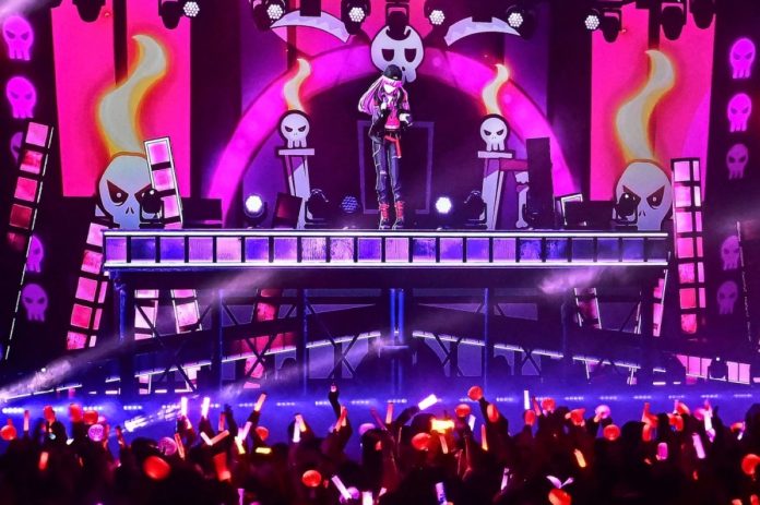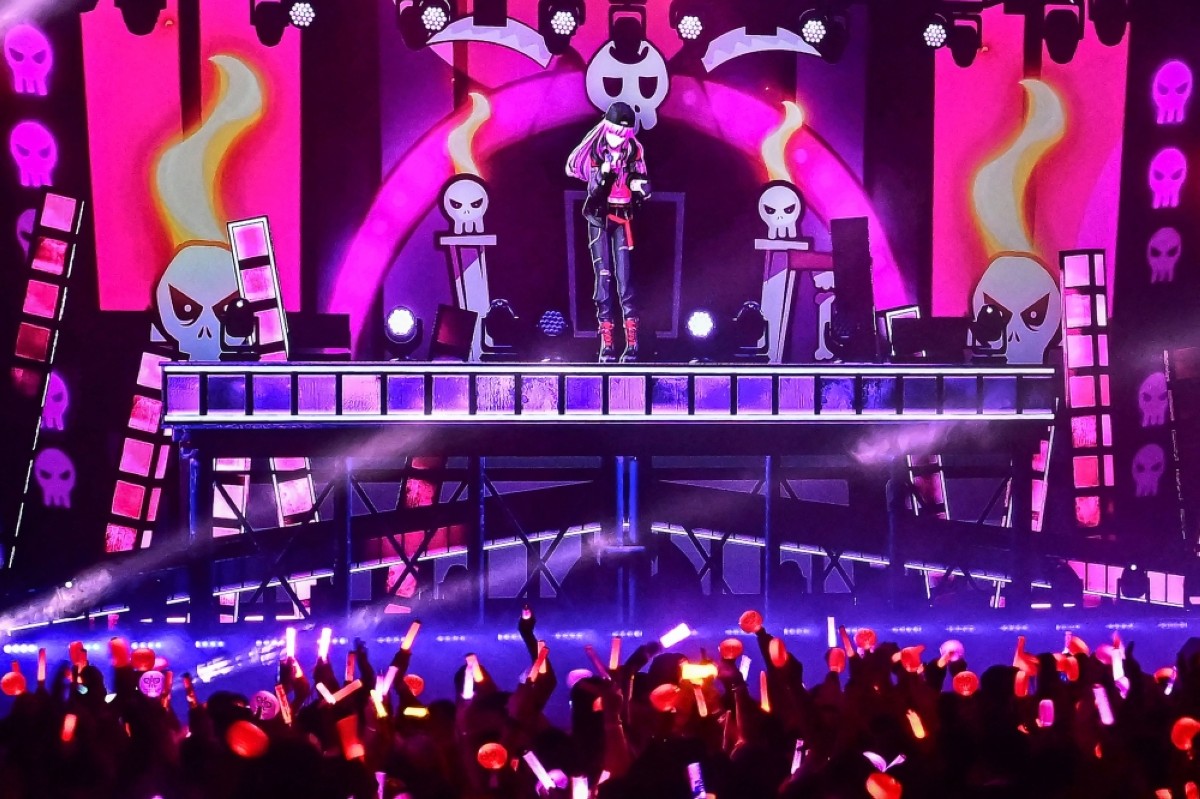 फ्यान स्टेजमा एक एनिमेटेड चरित्रमा एक एनिमेटेड चरित्रमा लम्बाई स्टिकहरू छन्, आफ्नो भर्चुअल मूर्ति प्रदर्शन भवनको लागि, जापानको “VTUBE” उपजेश्वर। गुलाबी कपाल भएका संगीतकार र लाइफरेन्क्सेनर मोरी कंडियोप एक एनिमे कार्नबाट चरित्र जस्तो देखिन्छ, एक होरारारा जस्तो भ्रममार्फत जीवनमा जीवनमा।