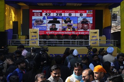 पत्रकार र एम आय पार्टीका समर्थकहरू (AAP) लेबल in मा दिल्ली राज्यको चुनावको अन्तिम नतिजाका लागि, फेब्रुअरी 1 मा दिल्ली राज्यको चुनावको लागि। (एपी)