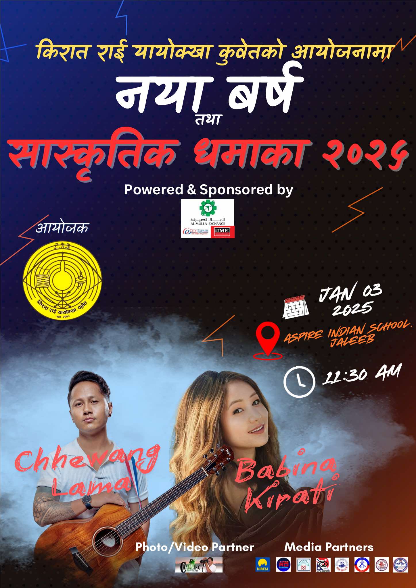 कुवेतमा आगामी जनवरी ३, २०२५ मा भव्य “नयाँ वर्ष तथा सांस्कृतिक धमाका २०२५” को आयोजना हुने भएको छ। किरात राई यायोक्खा द्वारा आयोजित यस विशेष कार्यक्रममा नेपालका चर्चित कलाकारहरू Chhewang Lama र Babina Kirati को मनोरञ्जनात्मक प्रस्तुति प्रमुख आकर्षण हुनेछ।