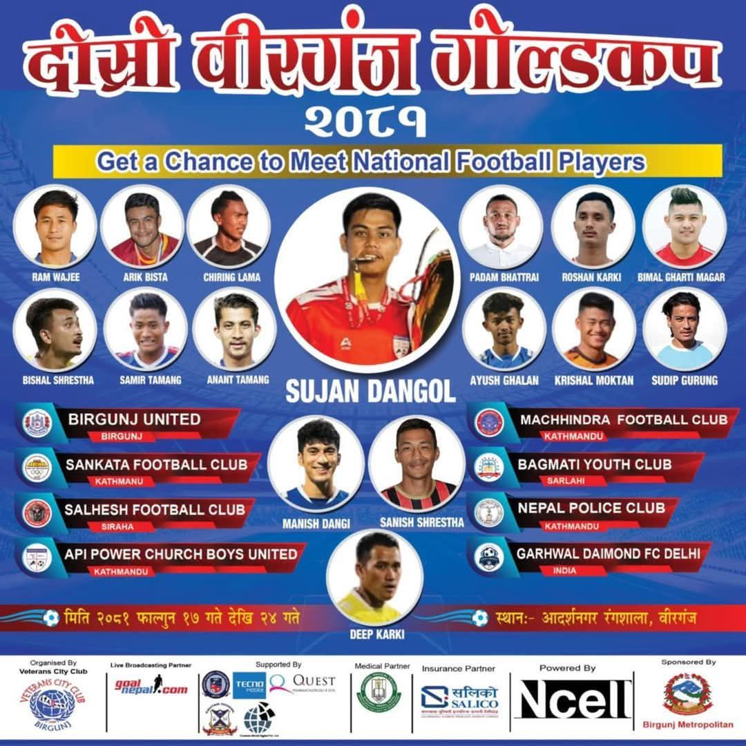 दिग्ग्रान शहर क्लब वीरगन्जले आयोजना गरेको टूर्नामेन्ट मार्च 1 सम्म चल्नेछ, आठ राष्ट्रिय-स्तर फुटबल टीमहरू प्रस्तुत गर्दछ।