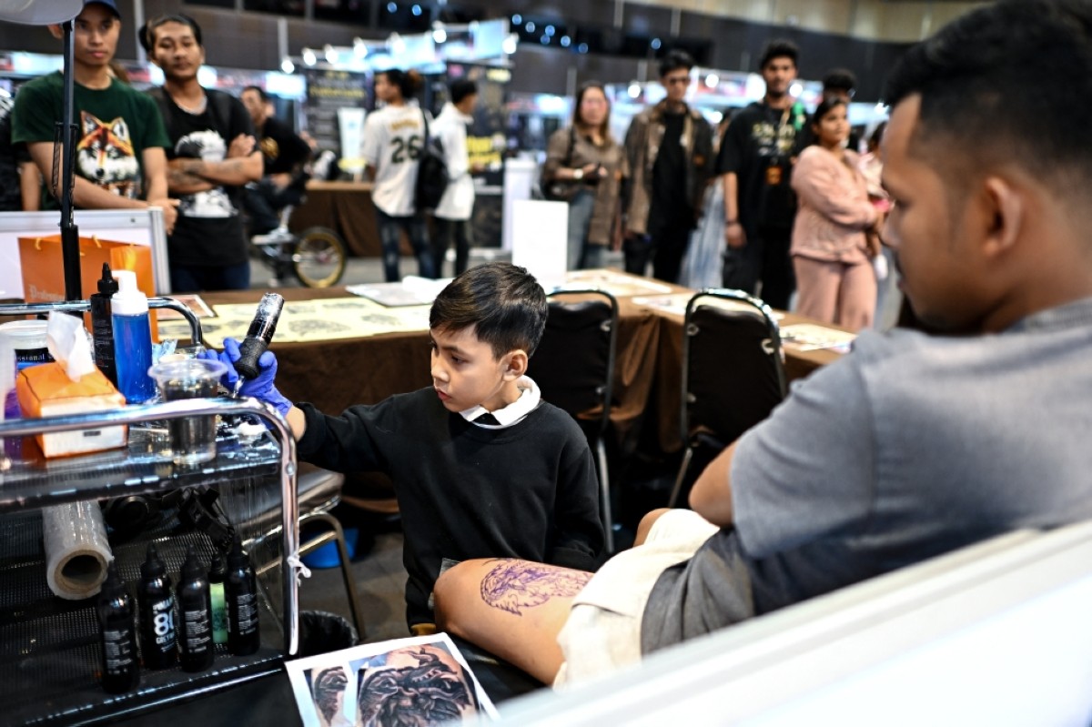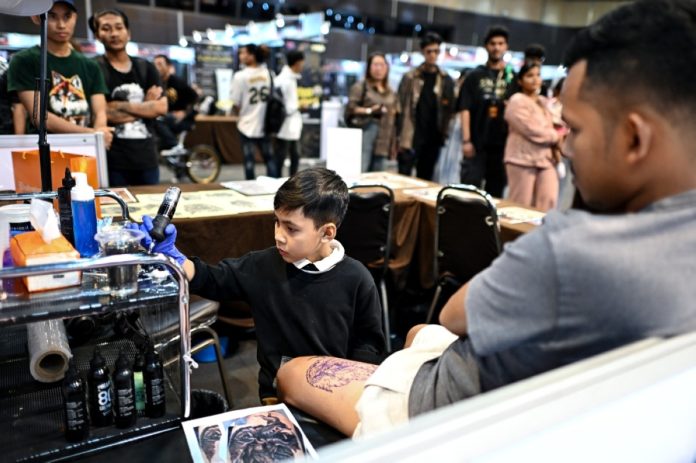 नौ वर्ष पुरानो नेप्सट मिटमेनाना, थाई बाल बाल ट्याटु कलाकार कलाकार कलाकारले 20225 थाईल्याण्डको ट्याटूको एक्सपोटोमा काम गर्दछ .– अफपी फोटोहरू