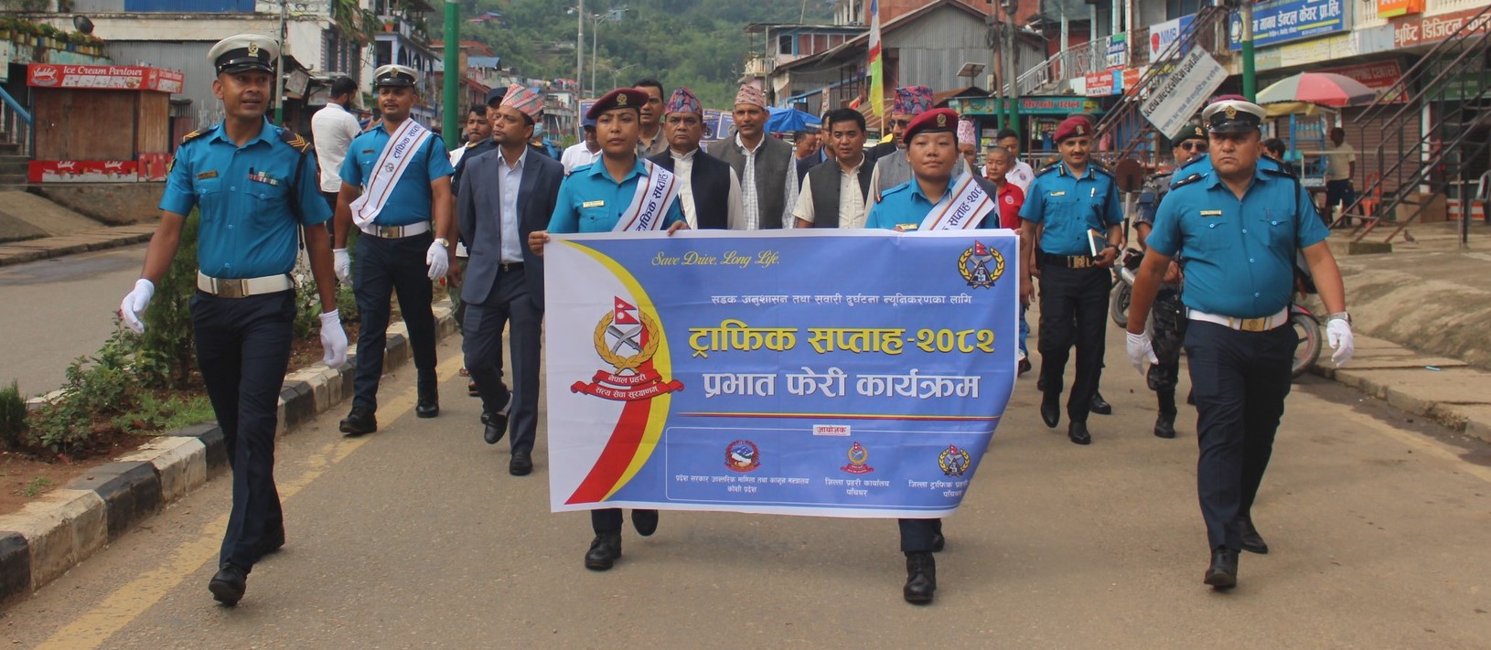 फिदिम बजारस्थित शिवालय मन्दिरबाट प्रभातफेरी आयोजना गर्दै यो सप्ताह सुरु गरिएको हो। र्यालीमा सहभागीले सवारी दुर्घटना हुन नदिन चालक पैदलयात्री र यात्रुले अपनाउनुपर्ने सावधानी सम्बन्धी सन्देश लेखेका प्ले कार्ड र ब्यानर बोकेका थिए ।