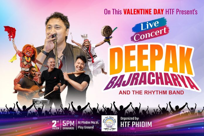 साढे दुई दशकअघिदेखि पपगायन र संगीत मार्फत उदाएका चर्चित गायक दिपक बज्रचार्य आफ्नो सांगीतिक समूह रिदम ब्याण्डसहित फागुन २ गते प्रेम दिवशको दिन फिदिम आउने भएका छन् । हेल्प टुगेदर पाँचथरको आयोजनामा बृहद साँस्कृतिक तथा फोटो प्रर्दशनी मेलामा फागुन २ गते प्रेम दिवशको दिन साँगेतिक प्रस्तुती दिनेगरी आफ्ना टोलीसहित आउन लागेको हेल्प टुगेदर पाँचथरका सचिब नबिन बुढाथोकीले जानकारी दिए ।