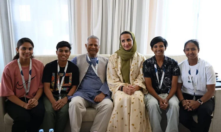 युनासले शेखहालाई चार महिला बंगलादेशी एथलीटरको साथ पल्टेको पीछा, जो Qf को निम्तोमा मुख्य सल्लाहकारहरु संगै।