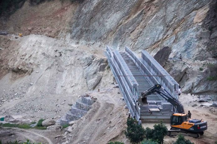 पाँचथर– पुल बगाएर बनाएको बेलिब्रिज पनि बगाएपछि मेची राजमार्गमा पर्ने पाँचथरको हेवा खोलामा ‘मोडुलर ब्रिज’ भोलीसम्ममा बारीपारी जोडिने भएको छ । ब्रिज जोड्दै ठेलेर पारि पु¥याउन लागिएको छ ।