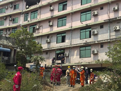 उद्धारकर्ताहरूले शुक्रबारको भूकम्पबाट पीडितको भूकम्पको शव निवासीको भूकम्पको शुक्रबारको भवनको शुक्रबारको भवनलाई बोक्दछ, मा म्यानमार। (एपी)