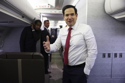 अमेरिकी राष्ट्र मार्को रुबियो सचिवसँग मिडियासँग यात्रा गरेपछि मिन्की सुरक्षा सम्मेलनका लागि एक यातायात मुद्दाले उनको विमानमा फर्काउन बाध्य पार्छन्। (एपी)