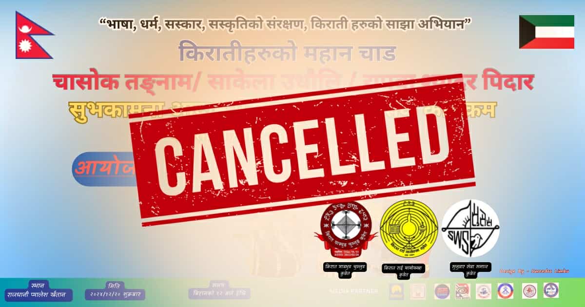किरात याक्थुङ चुम्लुङ कुवेत, किरात राई यायोख्खा कुवेत, र सुनुवार सेवा समाज साखा कुवेतको संयुक्त आयोजनामा गर्न लागिएको किराती सांस्कृतिक कार्यक्रम सम्बन्धित नयाँ उर्दिका कारण स्थगन गरिएको जानकारी गराउन चाहन्छौं।