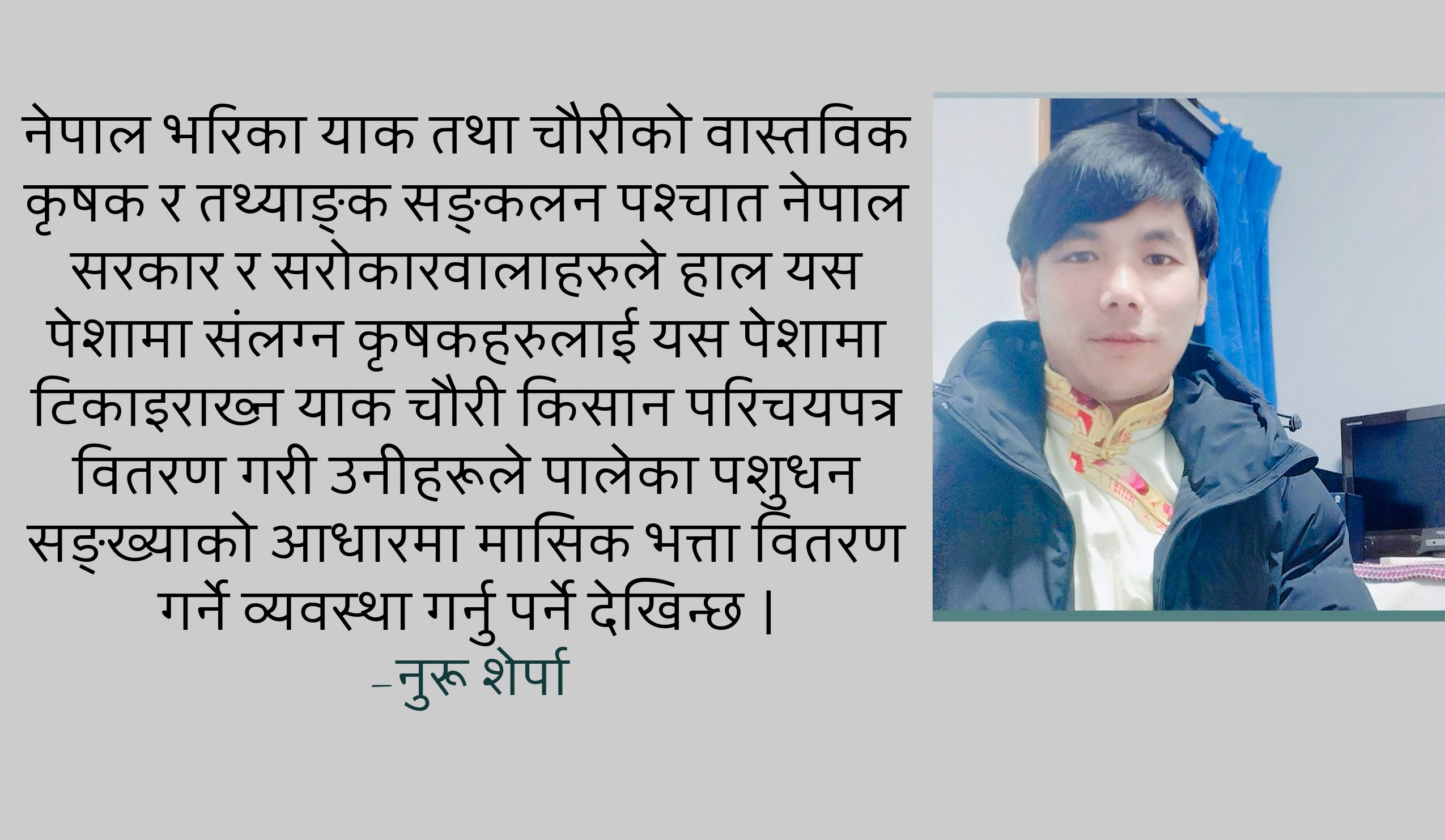 सदियौँ देखि राज्यको नजरमा नपरेका याक चौँरी कृषकहरू बल्ल सरकारले चाल पाएका छन् । हिउँदको हिमपात, बर्खामासको झरी, विषम परिस्थितिलाई सामना गर्दै दूरदराजका कृषक सम्म पुग्न सरकारले कृषक केन्द्रित प्रोत्साहन मुलक कार्यक्रम ल्याई हाल यस पेशामा आबद्ध कृषकलाई यो पेशामा टिकाइराख्न पहिलो प्राथमिकता दिनु पर्ने देखिन्छ । नेपाल सरकारको आर्थिक वर्ष २०७८÷७९ र २०८९÷८० को तथ्याङ्कलाई हेर्ने हो भने विश्वसनीय याक चौँरी तथ्याङ्क नरहेको पुष्टि हुन्छ । जसकारण कृषि तथा पशुपंछी मन्त्रालयको सर्कुलर र याक तथा चौँरी कृषक महासङ्घ नेपालको संलग्नतामा स्थानीय सरकारको पशु सेवा शाखासँग सहकार्य गरी तत्काल कृषकको विवरण सहित याक चौरीको वास्तविक तथ्याङ्क सङ्कलन गर्नु पर्ने देखिन्छ ।