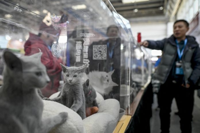 बेइजिंग अन्तर्राष्ट्रिय घरपालुवा जनावर आपूर्ति बेइजि in 20225 (पाल्तु जनावर निष्पक्ष बेइजिंग) मा एक बिरालो पछाडि लुक्ने छ .– अफपी फोटोहरू