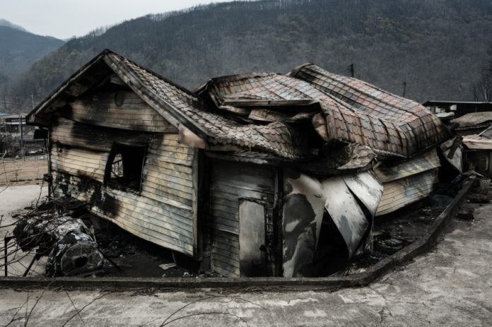 उनको बाली गुमाए पनि एक-वर्ष पुरानो एप्पल किसानले घुमाउँदा आफ्नो छिमेकीहरूको घरहरू लिएर हिंड्दा दुई दिन अघि, 20225 मा दक्षिण कोरियाले जलाइयो।